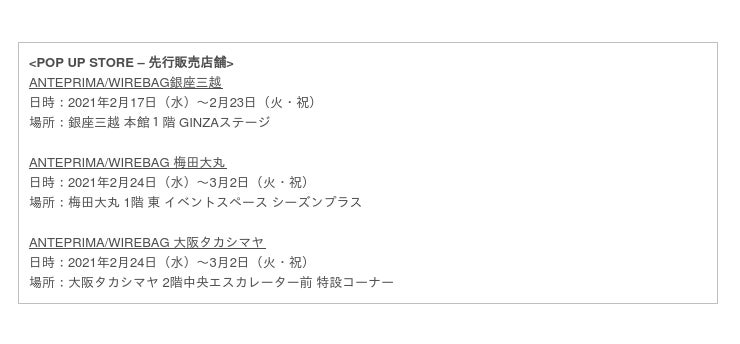 2021年2月17日(水)より、ANTEPRIMA/WIREBAG 銀座三越店とANTEPRIMAオンラインストアにて先行発売。