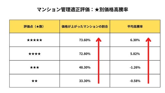 表4では、マンション管理適格評価(https://www.kanrikyo.or.jp/evaluation/)と価格が上がったマンションの割合と平均高騰率(2023年対2022年比)を表しています。評価点が高い(★が多い)程、価格が上がったマンションの割合も、平均高騰率も高くなる傾向にあります。