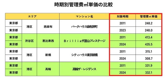 表1:東京都23区の代表的なマンションの時期別の管理費の比較