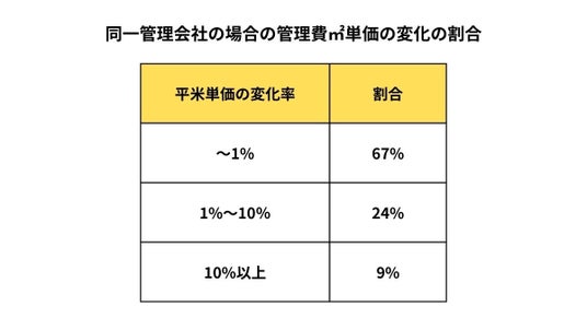表2では、2011年以降管理会社が変わっていない中古マンションの、2011年と直近の管理費平方メートル 坪単価を比較し、その変化率が調査対象の中古マンション全体のどの程度の割合かを調べました。1%未満が67%、1%~10%未満が24%、10%以上が9%と9割が10%未満の変化しか見られませんでした。