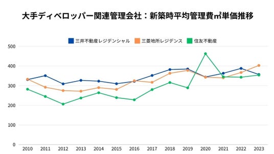 グラフ1では三井不動産、住友不動産、三菱地所レジデンスの関連管理会社の新築マンションの平均管理費平方メートル 単価の推移を示しています。ややばらつきがあるものの2016年以降はいずれの管理会社も単価の上昇が見られます。