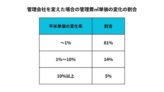 表3では、2011年から現在までに管理会社を変えた中古マンションの2011年と直近の管理費平方メートル 単価を比較し、その変化率が調査対象の中古マンション全体のどの程度の割合かを調べました。1%未満の物が81%、1%~10%未満が14%、10%以上が5%と10%未満が95%となり管理会社を変えた方が、以前の単価よりも変化がないという結果になりました。