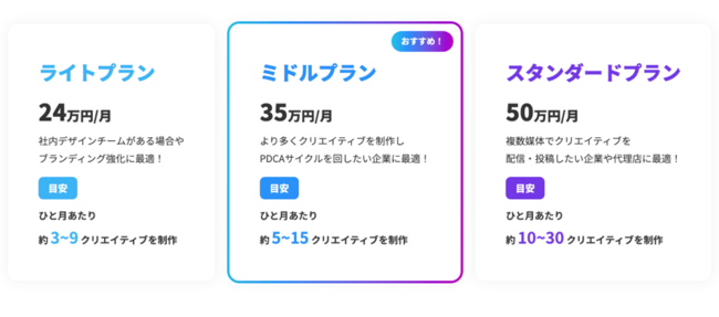 「まずは少ない本数で制作してみたい」、「月間の制作本数はそこまで多くない」などのニーズから、この度新たにライトプランとミドルプランの2つを加えた新しいプランをリリースいたしました。
