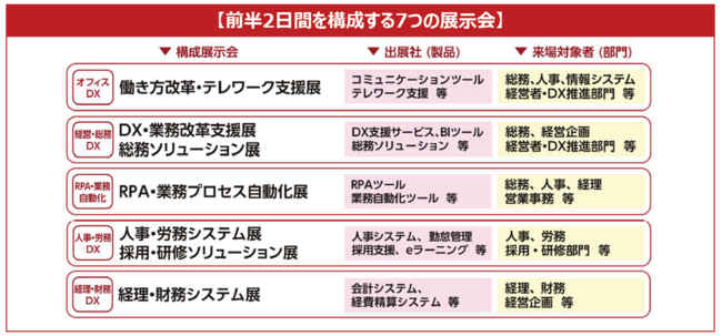 製品ジャンル毎に、7つの展示会で構成され、オフィス環境のDXから、管理部門特有の各種ルーティンワークや経営者・総務・人事・経理部門の業務効率化・生産性向上を支援する注目のIT製品が一堂に出揃う。