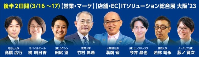 後半2日間(2023年3月16日[木]・17日[金])開催の「【営業・マーケ】【店舗・EC】 ITソリューション総合展 大阪’23」は、製品ジャンル毎に、8つの展示会で構成され、MA、CRM、SFA、アドテクから、営業効率化ツール、店舗のDX化、EC支援まで、営業・マーケティング部門および店舗・ECの売上アップ・業務効率化を支援する注目のIT製品が一堂に出揃う。