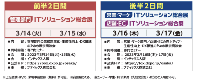 前半2日間(2023年3月14日[火]・15日[水])開催の「【管理部門】 ITソリューション総合展 大阪’23 」は、