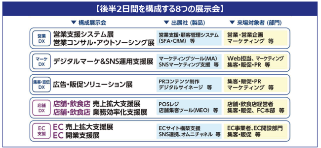 来場対象者は、DX推進に課題を持つ経営層に加え、営業、マーケティング、Web担当、集客・販促・PR担当、小売店、飲食店、EC等の方々である。なお、どの展示会も、来場には公式ホームページからの来場事前登録(無料)が必須となる。