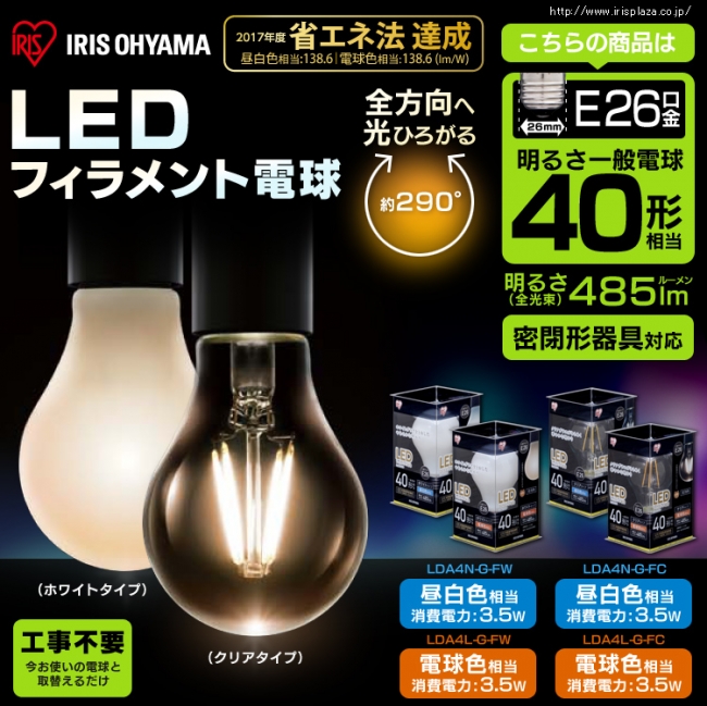 「LEDフィラメント電球 昼白色(485lm) LDA4N-G・電球色(485lm) LDA4L-G 全2色」