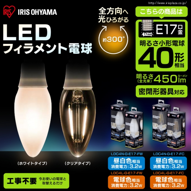 「LEDフィラメント電球 昼白色(450lm) LDC4N-G-E17・電球色(450lm) LDC4L-G-E17 全2色」