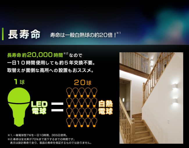 長寿命約20000時間なので、一日10時間使用しても約5年間交換が不要です。取り換えが面倒な高所への設置もおすすめです。