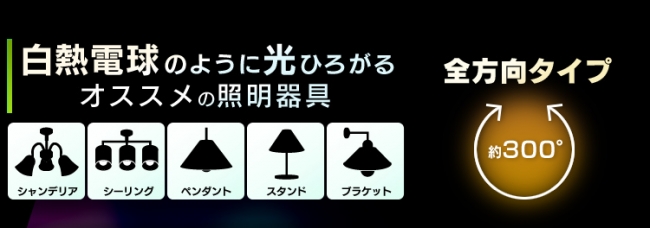 インテリア性が高く、白熱電球のように全方向に光が広がるので、シャンデリアやペンダント、スタンドライトなどの照明器具におすすめです。