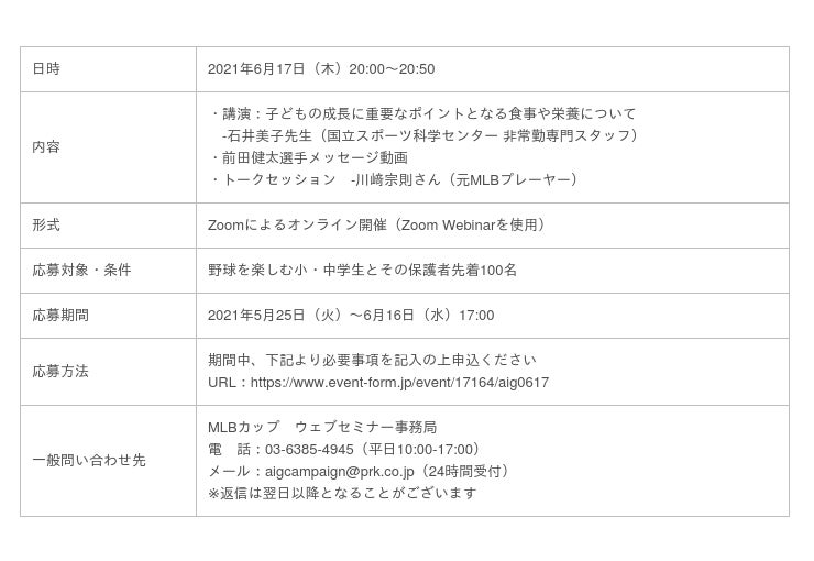AIGジャパン・ホールディングス株式会社(以下、AIG ジャパン)は、特別スポンサーを務める「MLBカップ」の関連プロジェクトを、5月より展開しています。第二弾ウェブセミナー『親子で学ぶ!子どもの成長に大切な食育』を、農林水産省の定める“食育月間”にあたる6月17日(木)に開催します。
