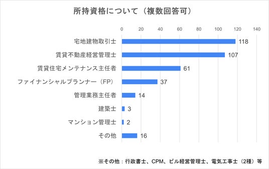 現在ほかに所持している資格は「宅地建物取引士」が118名で最多、次いで「賃貸不動産経営管理士」が107件、「賃貸住宅メンテナンス主任者」61名となりました。不動産関連資格を保有している層が大多数を占めている結果より、既に専門知識を持つ実務者層が、さらなるステップアップとして本資格を選択しています。