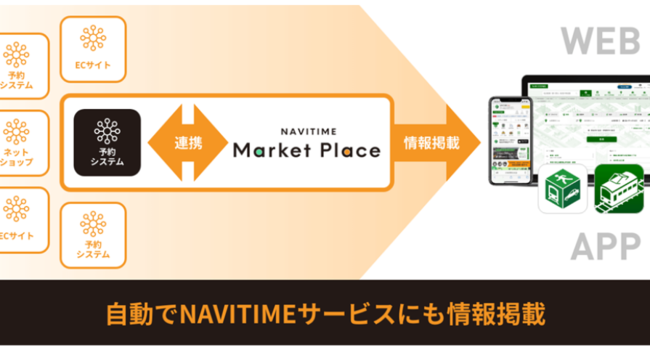 『NAVITIME Market Place Connect』は、予約システムやECプラットフォーム等の各種システムと、マーケティングプラットフォーム『NAVITIME Market Place』を接続し、システム側に登録されている情報を『NAVITIME Market Place』にも、自動的にまとめて掲載できる仕組みです。