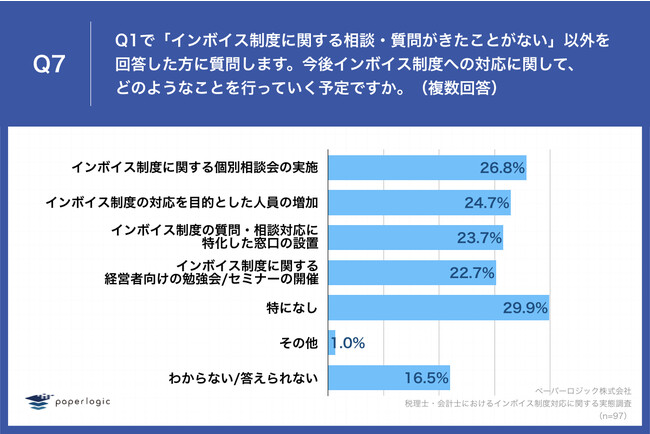 Q1で「インボイス制度に関する相談・質問がきたことがない」以外を回答した方に、「Q7.今後インボイス制度への対応に関して、どのようなことを行っていく予定ですか。(複数回答)」(n=97)と質問したところ、「インボイス制度に関する個別相談会の実施」が26.8%、「インボイス制度の対応を目的とした人員の増加」が24.7%、「インボイス制度の質問・相談対応に特化した窓口の設置」が23.7%という回答となりました。