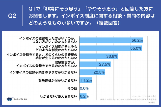 Q1で「非常にそう思う」「ややそう思う」と回答した方に、「Q2.インボイス制度に関する相談・質問の内容はどのようなものが多いですか。(複数回答)」(n=80)と質問したところ、「インボイスの登録をした方がいいのか、しない方がいいのかわからない」が56.2%、「インボイス制度がそもそもどのような制度かわからない」が55.0%、「インボイス登録をすると、どのくらいの消費税の納付が生じるのかわからない」が33.8%という回答となりました。
