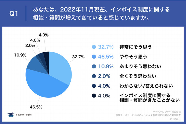 「Q1.あなたは、2022年11月現在、インボイス制度に関する相談・質問が増えてきていると感じていますか。」(n=101)と質問したところ、「非常にそう思う」が32.7%、「ややそう思う」が46.5%という回答となりました。