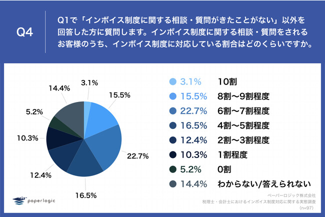 Q1で「インボイス制度に関する相談・質問がきたことがない」以外を回答した方に、「Q4.インボイス制度に関する相談・質問をされるお客様のうち、インボイス制度に対応している割合はどのくらいですか。」(n=97)と質問したところ、「6割~7割程度」が22.7%、「4割~5割程度」が16.5%という回答となりました。