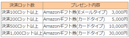 期間中の決済取引ロット数に応じて、Amazonギフト券(最大3万円分)をもれなくプレゼントいたします。