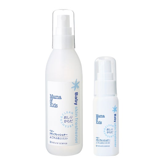 ママ&キッズ ベビースキンフレッシュナー新生児から使える、汚れ拭き取り用のミストローション。おしりに直接スプレーした後、おしり拭きで拭き取れば、ゴシゴシこすらずにうんち汚れやおしっこ、ニオイもきれいに落します。うるおいベールが肌を守り、おしりかぶれを防ぐ効果も。