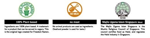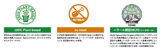 ↑Freedom Ramenのパッケージにデザインされている各マーク(左から100%植物性・NOMEAT・ハラール認定)
