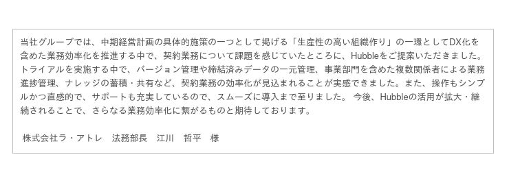 株式会社Hubble(東京都港区、CEO:早川晋平)が提供する契約書管理クラウドサービス「Hubble」が、LAホールディングスグループ 株式会社ラ・アトレ(本社所在地:東京都港区、代表者:脇田 栄一)に、2022年7月に正式導入され、9月より本格運用が開始されました。
