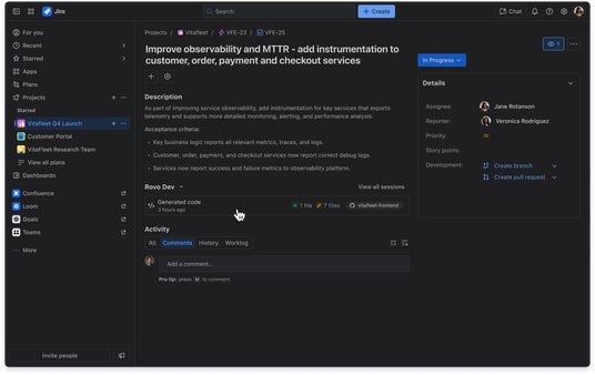 作業の起点と成果物(PRなど)がJiraのワークアイテムとひも付き、Rovo Devの計画や進捗もJira側で可視化されます。プロダクトマネージャーやデザイナーなどの非エンジニアも、いつも使っているJiraのワークアイテム画面から、AIがどんな変更を行ったかを把握できます。