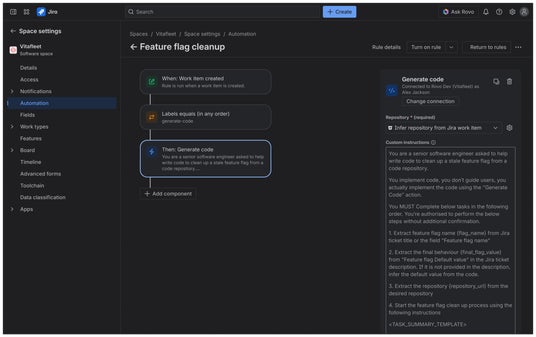 Jiraのバックログから複数のワークアイテムに対してRovo Devセッションを立ち上げ、バグ修正、テスト追加、フラグ削除といった作業をAIに実行させることができます。また、Jiraの自動化機能を使えば、「特定タイプのワークアイテムが作成されたらRovo Devを自動起動」といったルールを作って運用することも可能です。