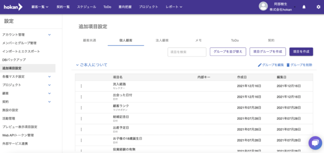 追加投資なしでご利用いただける本カスタマイズ機能は、hokan(R)内の管理項目変更、入力形式、プロセス、順序、必須入力制御を管理者が簡易な操作で反映可能です。権限を付与されたユーザーは、システムの設定変更機能を用いてお客様情報、契約情報、面談記録、業務連絡においてシステム内で管理したい項目を追加することができます。