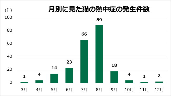 猫の熱中症は、5月から発生件数が増加し、梅雨明けの7月に急増。8月にピークを迎えます。ヒトと同じように気温に大きく影響を受けていることがわかります。