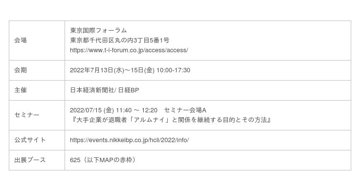また、7月15日(金)11:40~12:20 には、セミナー会場Aで『大手企業が退職者「アルムナイ」と関係を継続する目的とその方法』をテーマにセミナーを開催します。