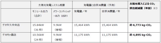 シェアリングエネルギーの提供する事業者向け太陽光PPAモデル『シェアでんき for Biz』のサービスによって、下記2店舗で屋上に太陽電池モジュールを設置して太陽光による発電を開始します。自家消費電力を太陽光発電による電力で賄うことが可能となり、年間約11,668 kg-CO2の排出量削減につながる見込みです。