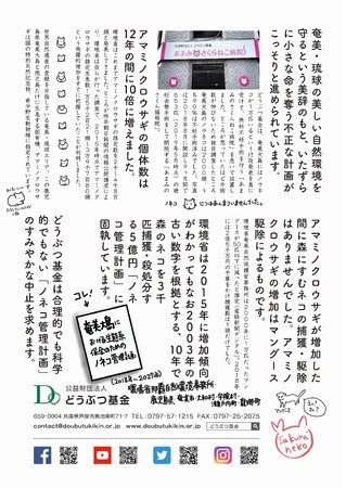 「クロウサギを絶滅させる新たな脅威ノネコを山から駆除しなければならない」という、大義名分で始まった「奄美大島における生態系保全のためのノネコ管理計画(2018年度~2027年度)」であるが、クロウサギは2003年から2017年までに奄美大島、徳之島ともに500%増加している。この間、ノネコ駆除は行われていない。(奄美で試験的に13頭の駆除が行われた)