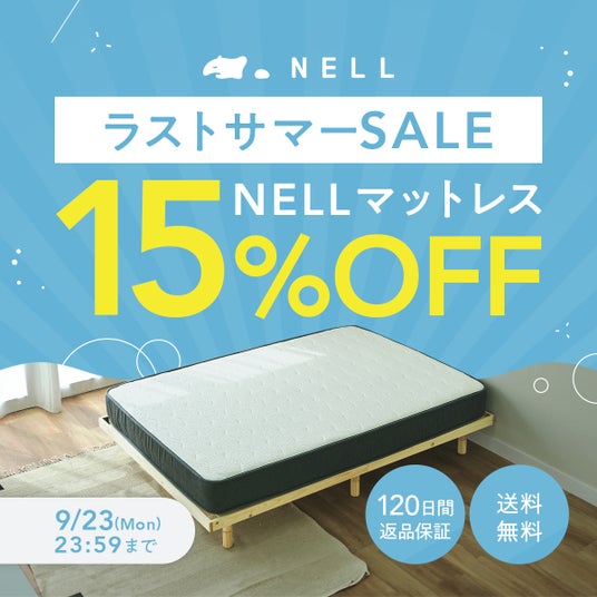 上質な寝心地を手に届く価格でお届けする、こだわりの寝具ブランド「NELL(ネル)」を提供する株式会社Morght(本社:東京都港区、代表取締役:土井皓貴、読み:モート)は、2024年8月30日(金)12:00から9月23日(月・祝日)23:59まで、NELLマットレスが全サイズ15%OFFとなる割引セールを実施します。