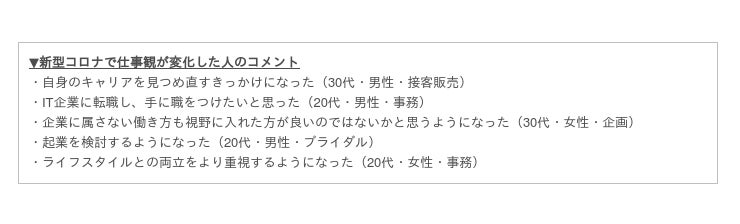 新型コロナの感染拡大がきっかけで仕事観(働き方・仕事・キャリアなどに対する考え方)への変化はあったかと聞いたところ、「はい」と回答した人が68.0%となりました。とくに「わざわざオフィスに行く必要が無く、これまで多くの無駄があったことに気づいた」(30代・男性・営業)、「都心部に職場がある必要性に疑問を覚えた」(30代・男性・SE)など、出社やオフィスの必要性などについての考えが変わったという意見が多く、「在宅勤務できる仕事が選択肢の一つになった」(20代・女性・事務)、「実家近くの県での仕事に就くため転職活動を開始した」(20代・女性・団体職員)など場所に捉われない働き方を視野に入れるようになった人が多いことがわかりました。