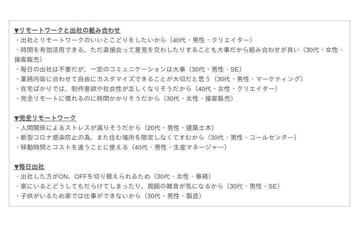 自由に働き方が選べるとしたらどの働き方(勤務形態)を選ぶか聞いたところ、「リモートワークと出社の組み合わせ」で働きたいと回答する人が79.0%、「完全リモートワーク」で働きたい」とする人は10.6%という結果となり、約90%の人がリモートワークを希望していることがわかりました。ただ、リモートワークと出社の組み合わせを希望する人が多いことから、今後はこれまでの働き方と新しい働き方のそれぞれ良い部分を融合させて働くという柔軟性を持つべきだと考える人が多いことが見て取れる結果となりました。