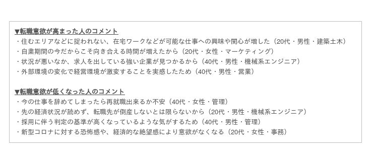 転職意欲が上がった人の意見を見ると「会社の業績が著しく低下、明るい未来が描けなくなった」(40代・女性・管理)、「業界全体が不安定になった」(30代・男性・機械系エンジニア)など、勤務先や業界全体の将来性を危惧する意見のほか、「自分の求める働き方を実現したい」(40 代・女性・マーケティング)など、コロナ禍で働き方の多様化が進む中で自身の働き方を見直したという意見が多数挙がりました。ほかにも、「求人が減るのは予想できたが、より競争率が高くなるので意欲が増した」(30代・女性・事務)や、「今求人を出しているところは伸びている企業と言える。年齢や、現職で給与が下がったこのタイミングで真剣に動き始めた」(30代・男性・営業)など、今が転職のチャンスだと前向きに捉える意見も目立ちました。