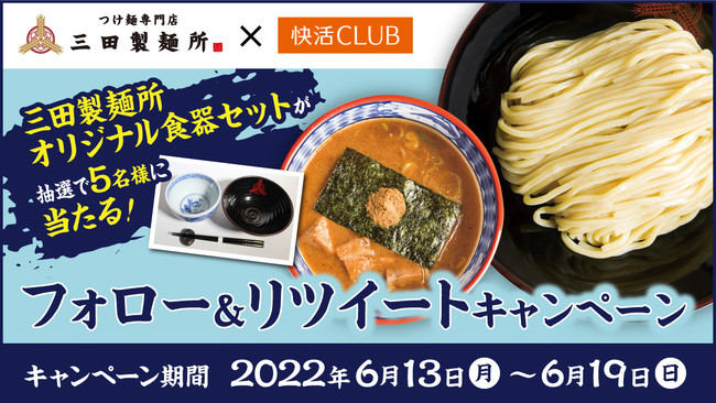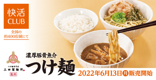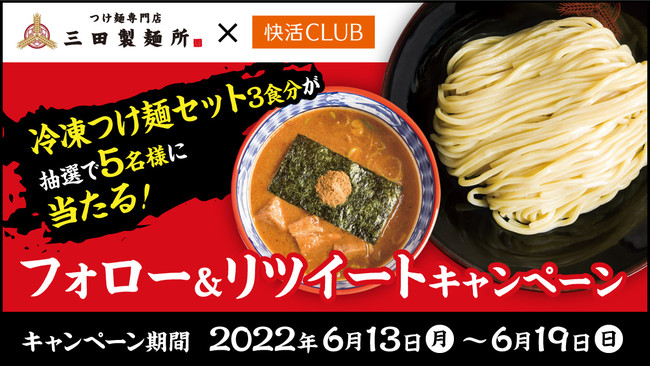2022年6月13日(月)より、株式会社エムピーキッチン(代表取締役:村上竹彦)が運営する「つけ麺専門店 三田製麺所」監修の『濃厚豚骨魚介つけ麺』を、株式会社快活フロンティア(代表取締役社長:東 英和)が運営するネットカフェ「快活CLUB」の全国約400店舗にて販売いたします。また、同日より両社の公式Twitterにて、冷凍つけ麺3食セットや三田製麺所オリジナル食器セットが当たる、『フォロー&RTキャンペーン』も開催。