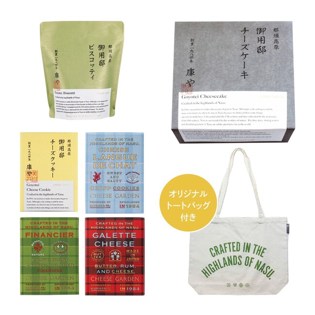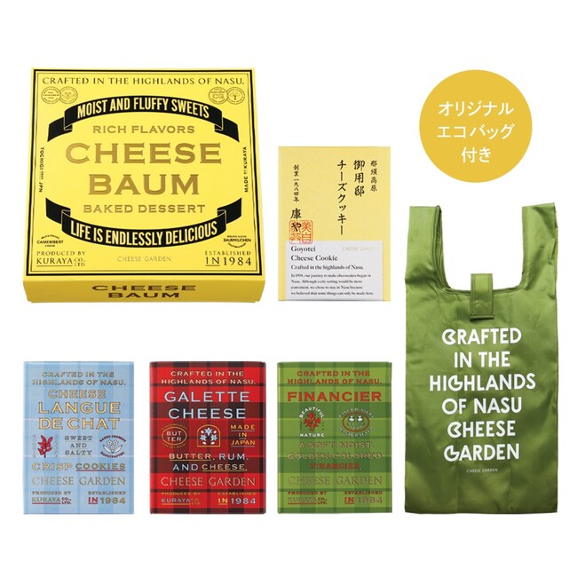 オープンを記念して、人気商品がお得にご購入いただけるハッピーバッグ2種類を数量限定で販売いたします。『ハッピーエコバック』はチーズの風味が存分にお楽しみいただけることで人気の『チーズバウム』に加えて人気の焼菓子4種をチーズガーデンエコバッグに入れました。また、『ハッピートートバック』はしっとりとした食感と濃厚な味わいでチーズガーデンの人気No.1を誇る『御用邸チーズケーキ』をはじめ、ブラックペッパーのピリっとした辛さがお楽しみいただける『御用邸チーズクッキー』、『御用邸チーズケーキ』を独自の製法で水分を抜き2種類の砂糖をまぶして仕上げたザクザク食感の『御用邸ビスコッティ』の3商品に加えて人気の焼菓子3種を詰め合わせにしてチーズガーデンオリジナルトートバッグとセットでご用意いたしました。どちらもチーズガーデンの人気スイーツが一度にお楽しみいただける特別なセットとなっております。数量限定での販売となりますので、お早めにお立ち寄りください。