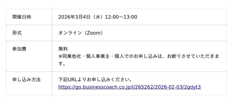 ビジネスコーチ株式会社(本社:東京都港区、代表取締役社長:細川 馨、東証グロース:9562)は、3月4日(水)に、株式会社KAKEAI 代表取締役 皆川 恵美氏をお招きし特別セミナーを開催いたします。