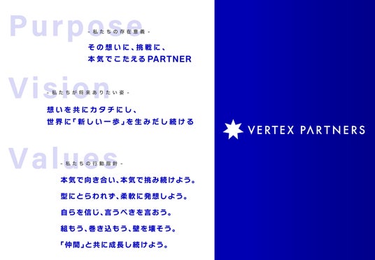2015年の創業以来、私たちは自走化をゴールに戦略策定から実行までを一気通貫でサポートする伴走型コンサルティングを強みに、「未踏の頂(=VERTEX)」を目指す企業の“真のパートナー”として、クライアントの事業成長や変革に真摯に寄り添い、共に歩んでまいりました。