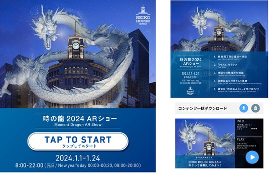 SoVeC(ソベック)株式会社は、国内初(※1)のVisual Positioning System(以下 VPS)(※2)技術で日常空間にAR(拡張現実)を表示させるロケーションベース次世代ARアプリ「XR CHANNEL」(※3)にて、2024年1月1日(月・祝)から1月24日(水)の期間、銀座四丁目 SEIKO HOUSE GINZAの新年を祝う特別なウインドウディスプレイと連動した「時の龍 2024」ARショーを実施しています。