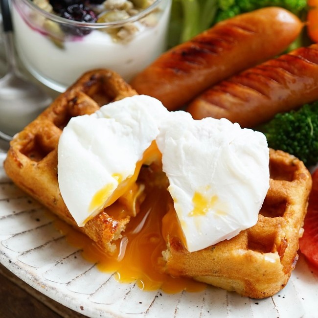 4.チーズ・ベーコン・ブラックペッパーの香ばしい香りと焼き立てのようなワッフルのサクサク食感をお楽しみください