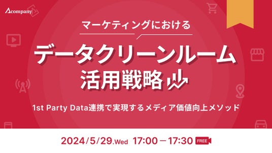 株式会社Acompany(アカンパニー、愛知県名古屋市西区、代表取締役CEO 高橋亮祐、以下Acompany)は、マーケティングで重要なデータクリーンルームの活用について紹介するウェビナー「マーケティングにおけるデータクリーンルーム活用戦略~1st Party Data連携で実現するメディア価値向上メソッド~」を、5月29日(水)開催します。