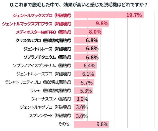 「ジェントルマックスプロ(19.7%)」、「ジェントルマックスプロプラス(9.8%)」と上位2つに熱破壊式脱毛機が選ばれていました。
