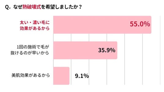 「太い・濃い毛に効果があるから(55.0%)」が最も多く、次の「1回の施術で毛が抜けるのが早いから(35.9%)」も合わせて、熱破壊式脱毛に対して高い効果を期待している人が多いことがわかります。