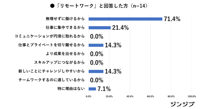 理想の働き方に関する質問で「リモートワーク」と回答した方の7割以上の方が「無理せずに働けるから」と回答しました。