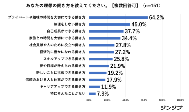 理想の働き方「プライベートや趣味の時間を大切にできる働き方」64.2%に次いで「無理をしない働き方」が45%。