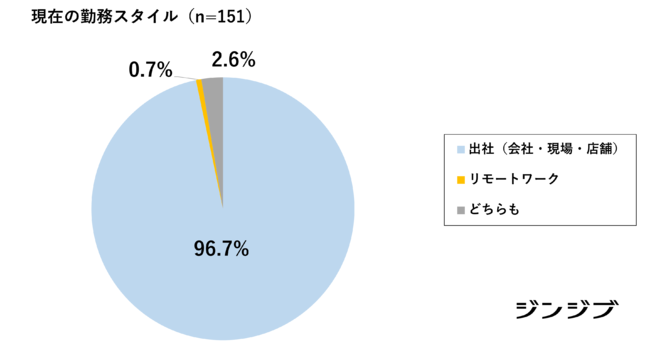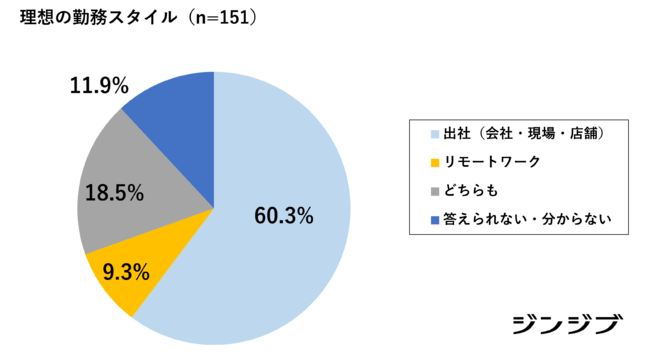 現在の勤務スタイルについて質問したところ「出社」146名、「リモート」1名、「どちらも」が4名と、アンケート回答者の現状の勤務スタイルは「出社」の方が多い結果となりました。最も多かった「出社」と回答した方に理想の働き方についてさらに質問しました。