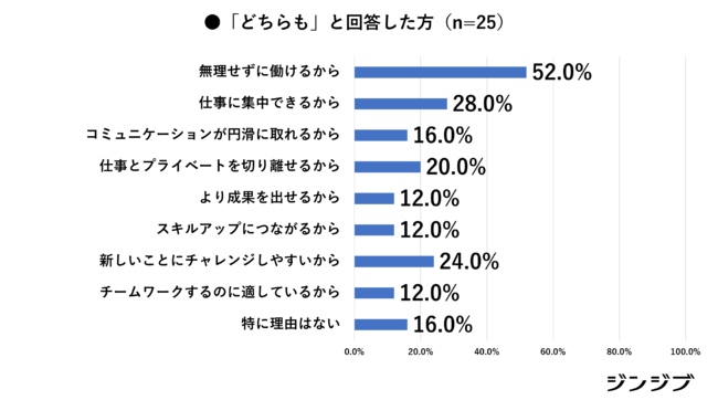 理想の働き方に関する質問で「どちらも」と回答した方の理由は、「リモートワーク」と回答した方と同様に「無理せずに働けるから」の回答が半数を超えました。次いで、「仕事に集中できるから」が28%、「新しいことにチャレンジしやすいから」が24%、「仕事とプライベートを切り離せるから」が20%でした。